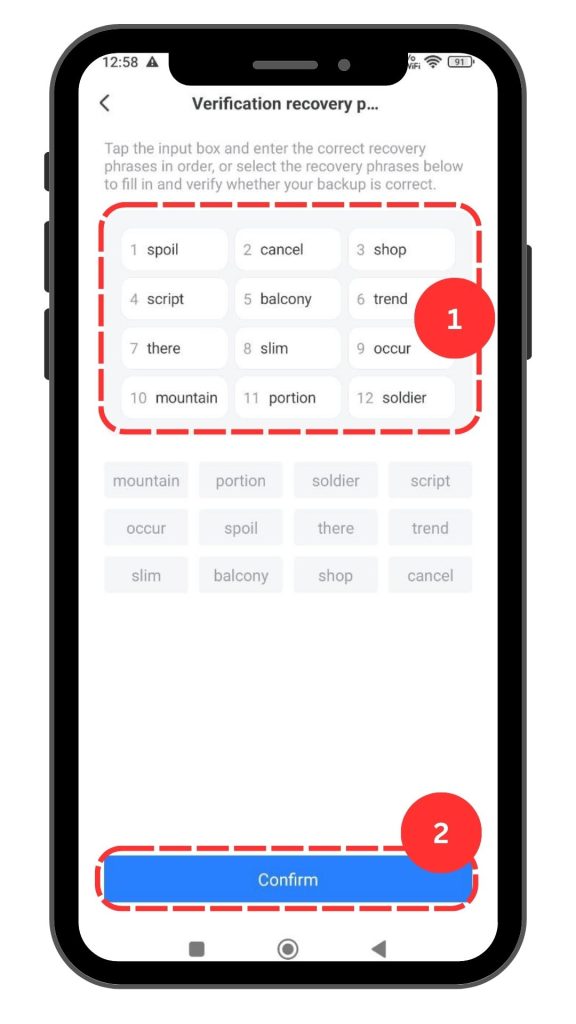 1οΈβ£ Masukan “Recovery Phrase” ikut susunan. Lihat semula screenshot yang anda dah ambil tadi.