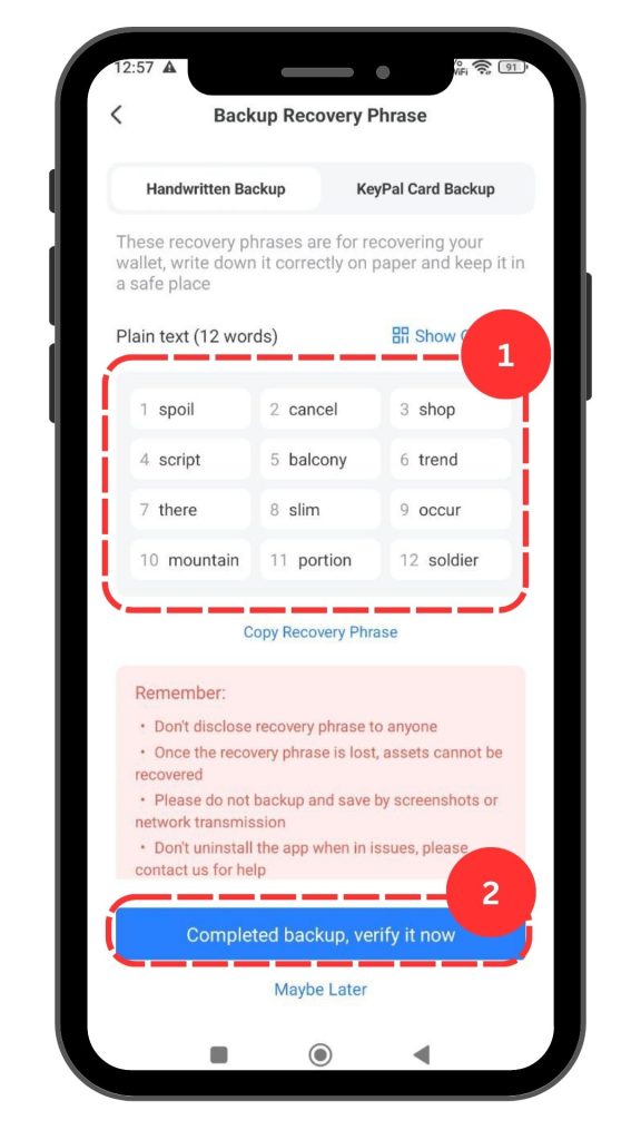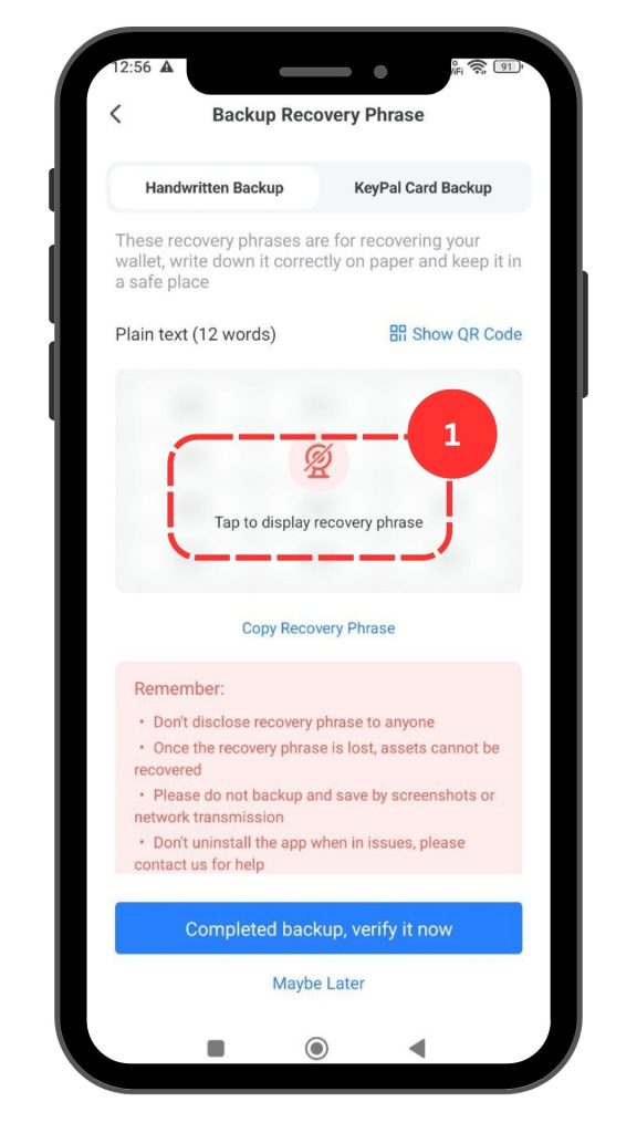 1οΈβ£ Screenshot atau Salin Paparan “Recovery Phrase.